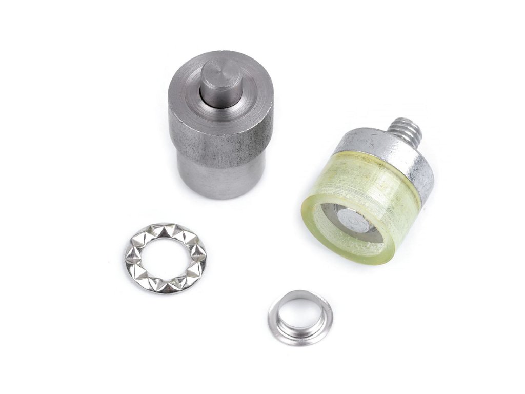 Kovový piston je určený k nýtování [průchodek s kamínky Ø10 mm.] Skládá se ze dvou částí. Používá se tak, že větší část pistonu se umístí v dolní části lisu a vloží se látka s průchodkou. Druhá část se zašroubuje do horní části lisu.