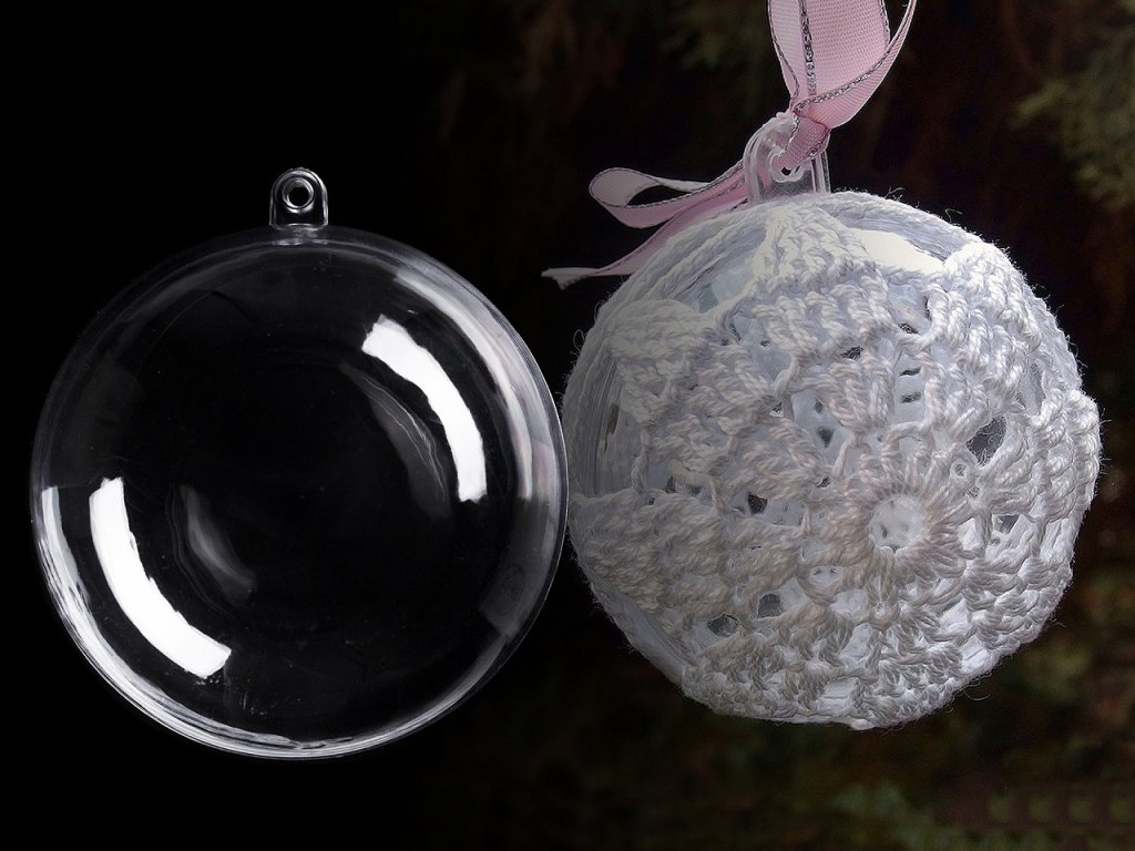 Průhledná plastová koule se skládá ze dvou částí, které se spojí a pomocí očka ji můžete pověsit jako dekoraci. Jedná se o polotovar, který je určen k dozdobení např. jej můžete obháčkovat, dekorovat metodou quilling, ubrouskovou technikou, dozdobit glitry atd.