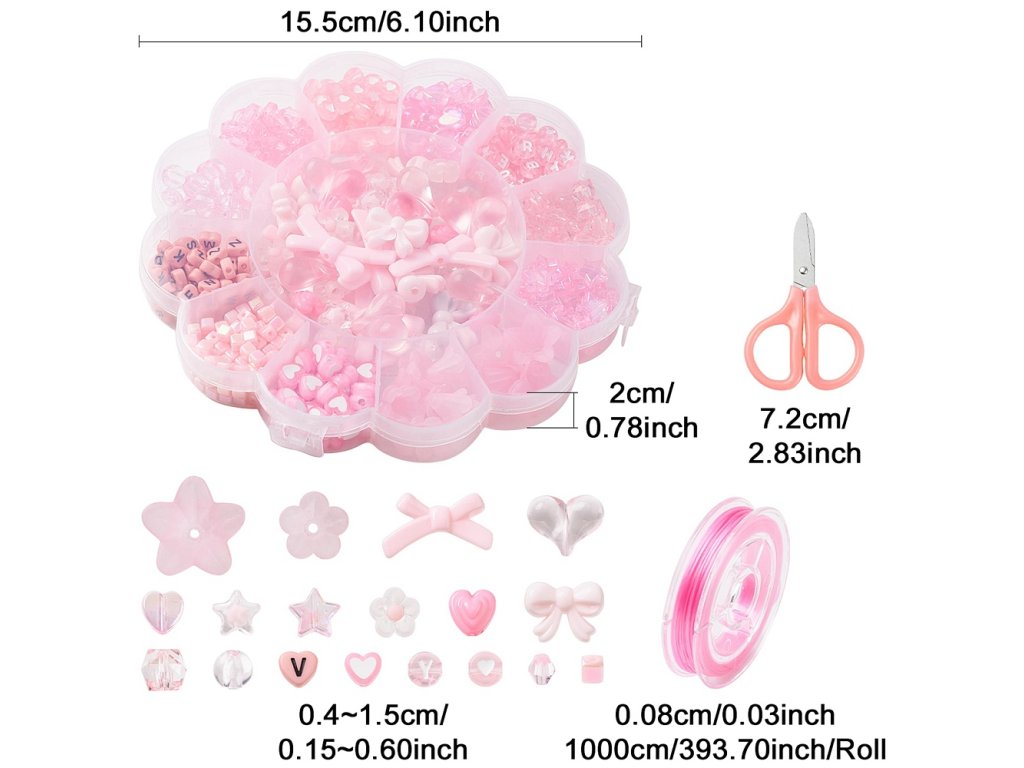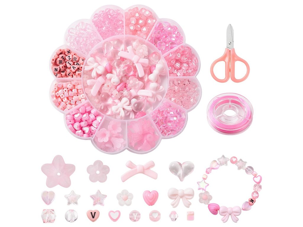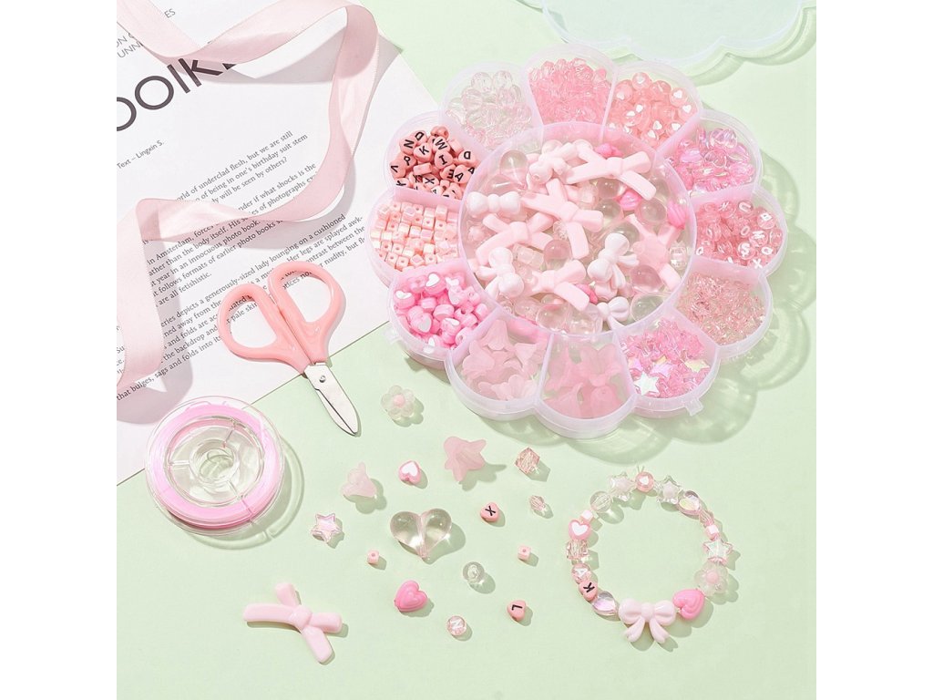 Tato bohatá kreativní sada v růžových tónech obsahuje vše potřebné pro výrobu originálních náramků a doplňků. Najdete v ní akrylové korálky mnoha tvarů, jako jsou srdíčka, hvězdy, květiny či mašličky, které doplňují korálky s písmeny pro tvorbu jmen a nápisů. Součástí balení jsou také nůžky a elastické vlákno, takže se můžete okamžitě pustit do tvoření stylových šperků pro sebe nebo své blízké.