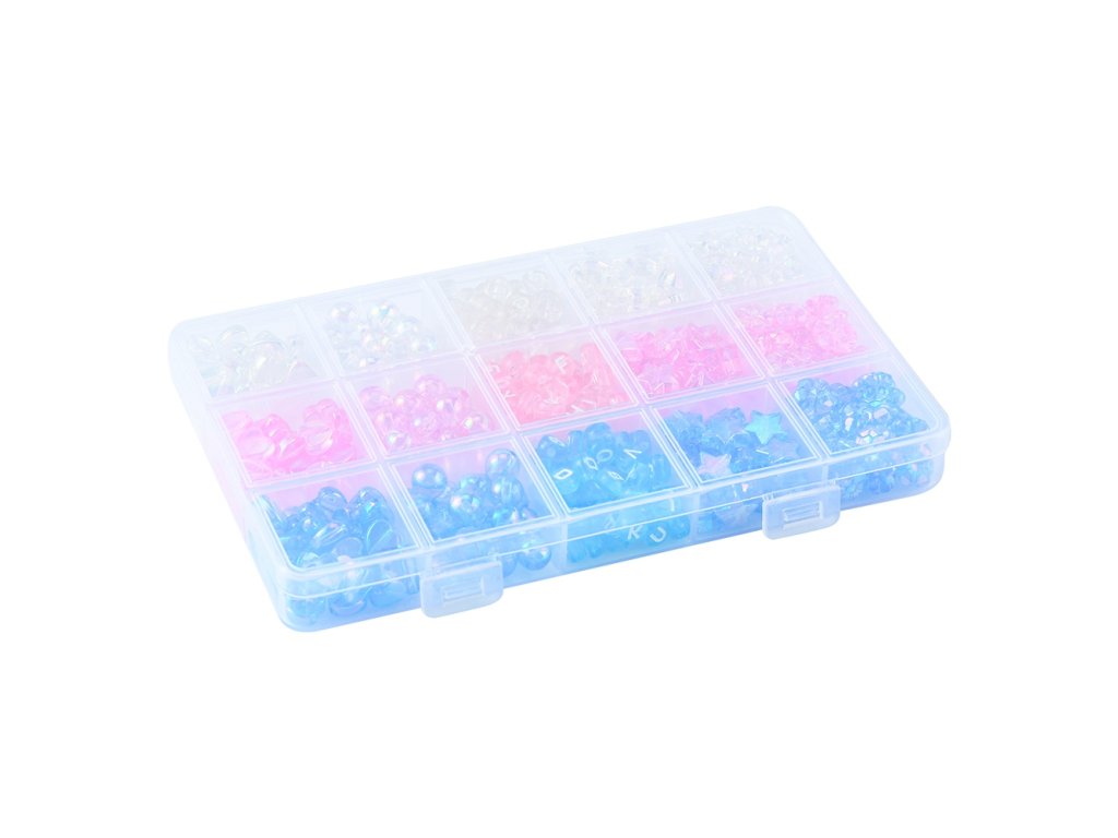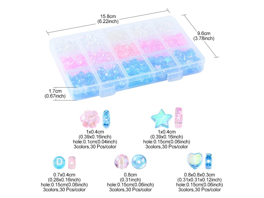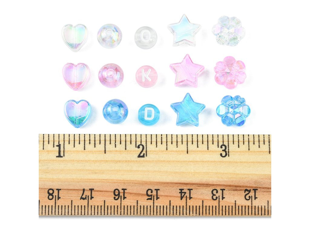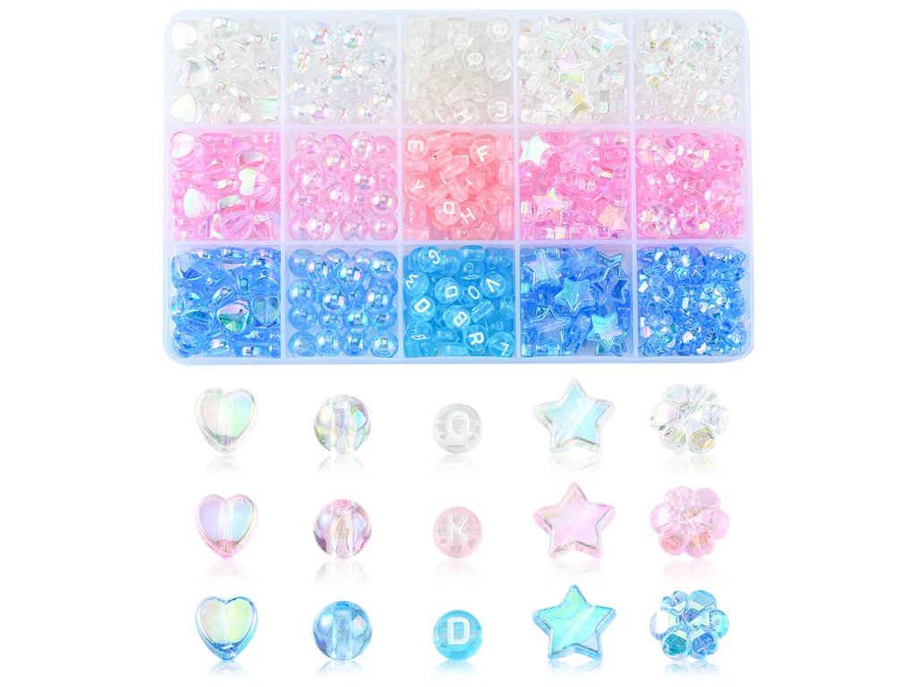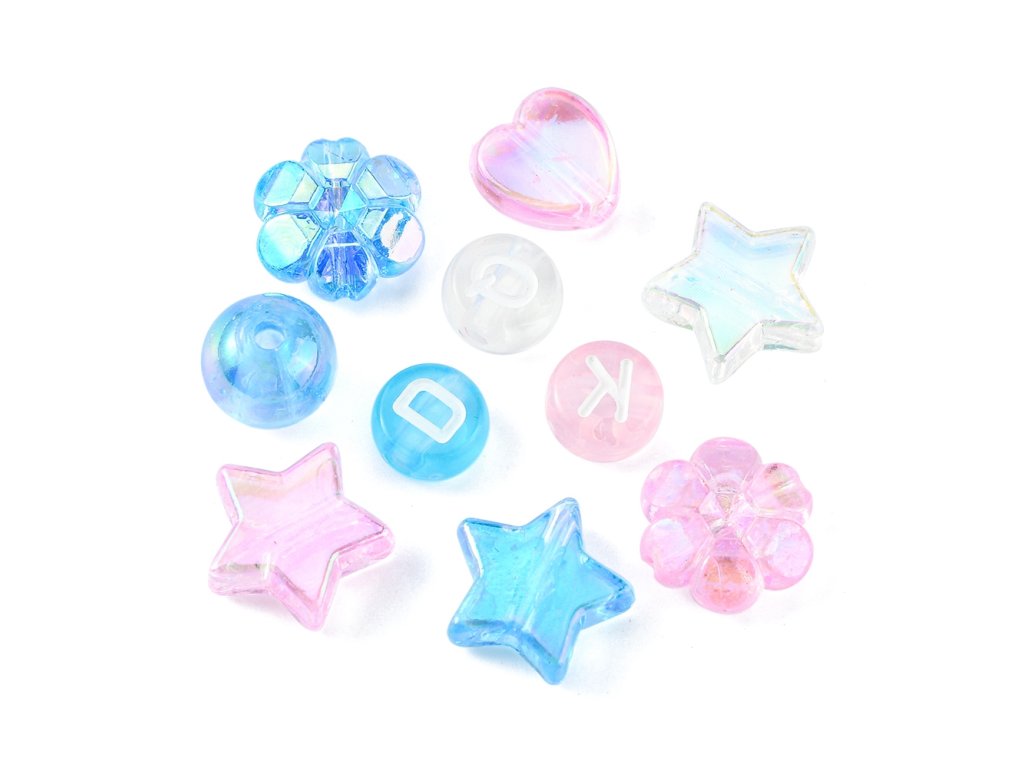 Akrylové korálky s elegantním transparentním vzhledem v různých barevných odstínech, ideální pro výrobu šperků. Jsou vhodné na tvorbu náramků, náhrdelníků nebo jako dekorativní prvky. Korálky v 15 různých stylech zahrnují hvězdu, srdce a květ, se kterými vytvoříte jedinečné a stylové šperky s moderním designem.