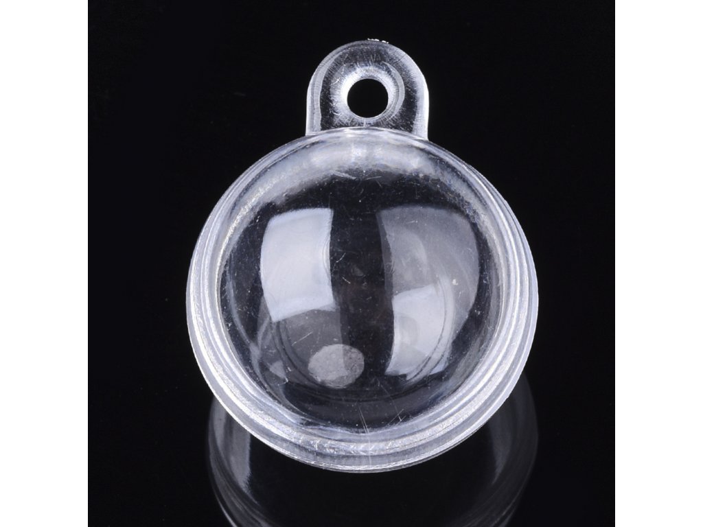 Průhledná plastová koule se skládá ze dvou částí, které lze spojit a pomocí očka zavěsit jako dekoraci.