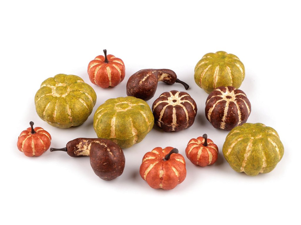 Dekorační mini dýně vyniknou v podzimních vazbách, věncích, truhlících i v květináčích. Jsou lehoučké, vyrobené z polystyrenu a efektně barevně vystínované.
