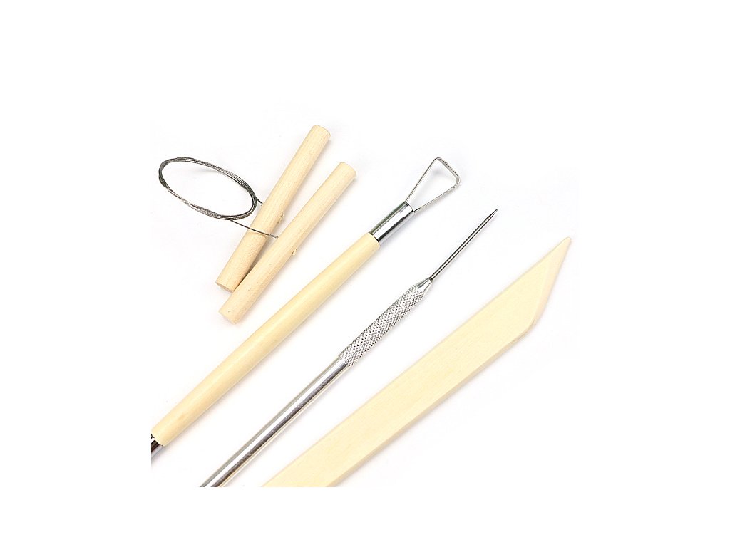 Použití: Sadu využijete při práci s keramickou hlínou k odřezávání přebytečných kousků pomocí struny, k vyhlazování povrchů mokrou houbičkou nebo stěrkou a k vytváření jemných detailů a textur pomocí modelovacích oček a jehly.
