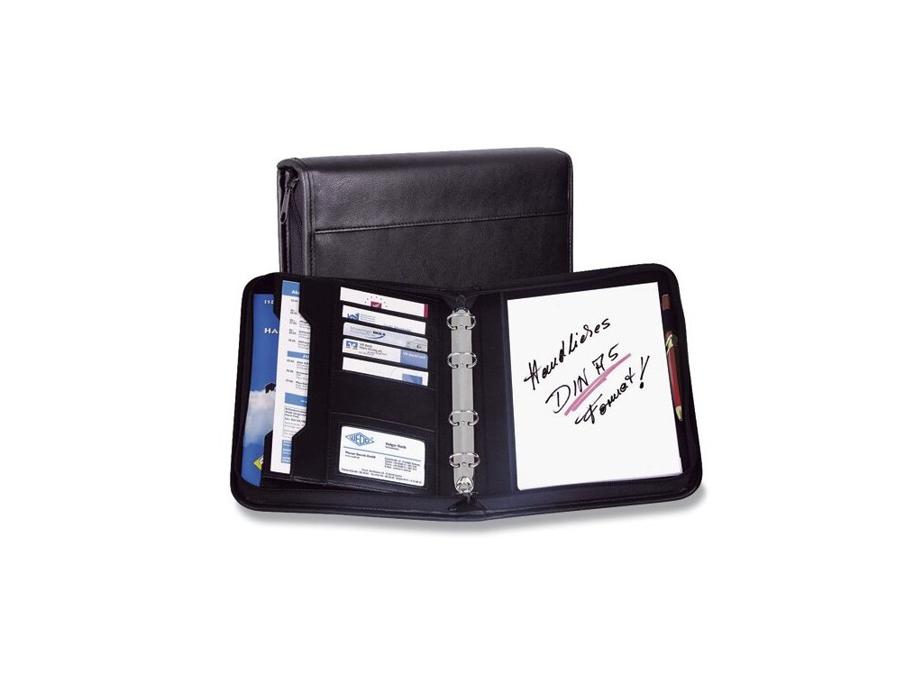 Moderní a zároveň elegantní spisovka vhodná na dokumenty formátu A5. Má 4kroužkovou mechaniku (průměr kroužků 30 mm, výška plnění 20 mm), kapsu na blok velikosti A5, kapsu na dokumenty, 5 kapes na karty a průjlednou kapsu na vizitku, pero je možné uchytit pomocí pružného poutka.