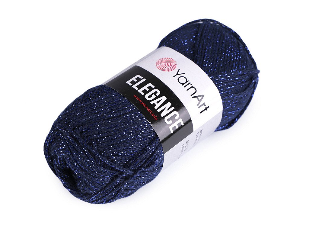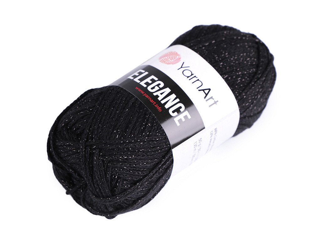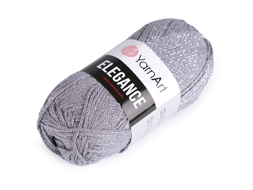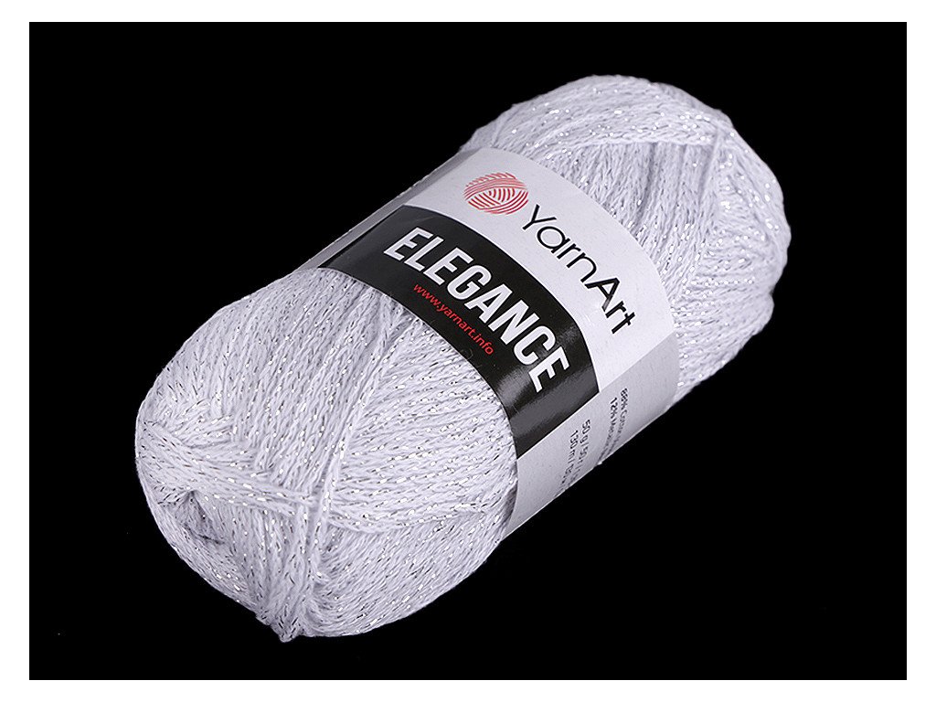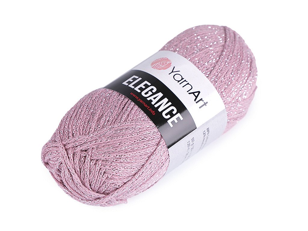 Pletací příze Elegance připomíná provázek. Je protkaná třpytivým lurexem. Můžete z ní uplést či uháčkovat svetříky, šály, čepice apod.