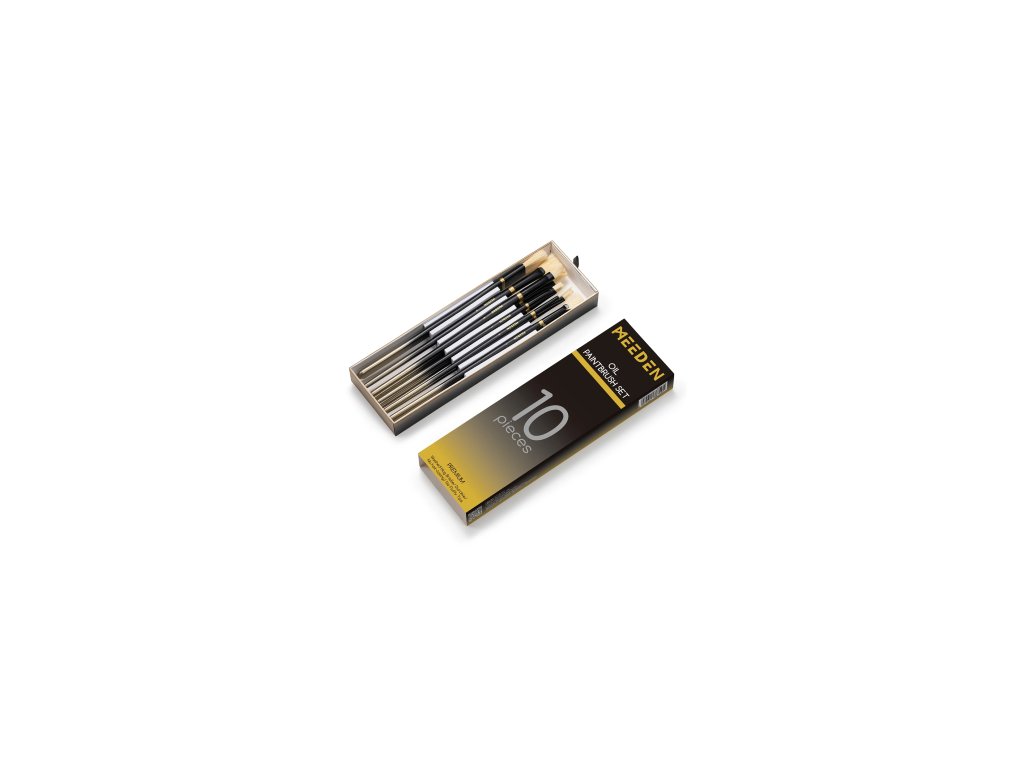 Sada deseti přírodních štětců různých tvarů a velikostí pro práci s olejovými barvami. Sada obsahuje vějířové, ploché, tupovací a kulaté štětce. Štětce mají tvrdší přírodní štětiny, které jsou vhodné na plátno, textil, dřevo, hrubou zeď. Vlasce jsou pevně připojené k rukojeti a nevypadávají. Pro zachování štětce čistěte nejprve v terpentýnu nebo jiném ředidle a poté umyjte spolu s mýdlem na štětce.