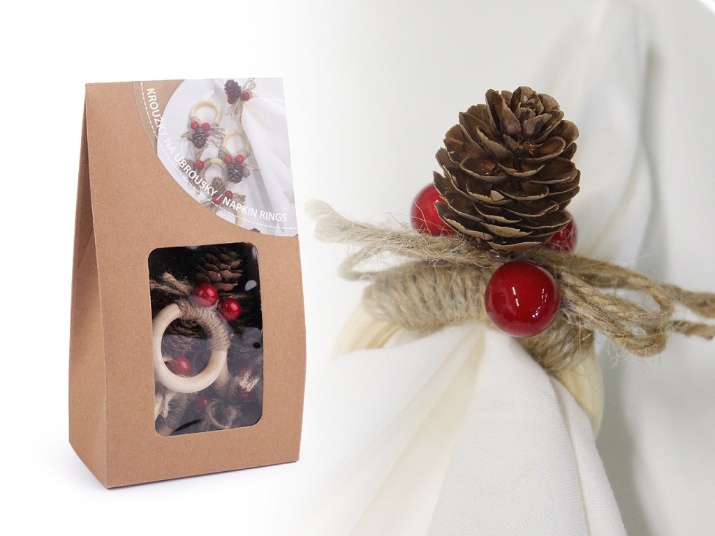 Kroužky na ubrousky v přírodním stylu ozdobí sváteční tabuli během zimních svátků. Na dřevěném kroužku jsou nalepené dekorační bobule, přírodní šiška a jutový provázek.
