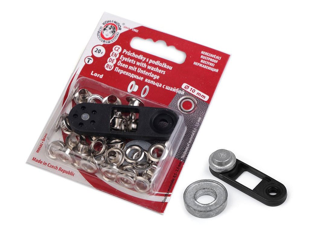 Nýtování se provádí ručně mini lisem, který je součástí balení, nebo lisem, který najdete pod kódem 630344. Na vysekávání děr do látky doporučujeme použít výsečník.