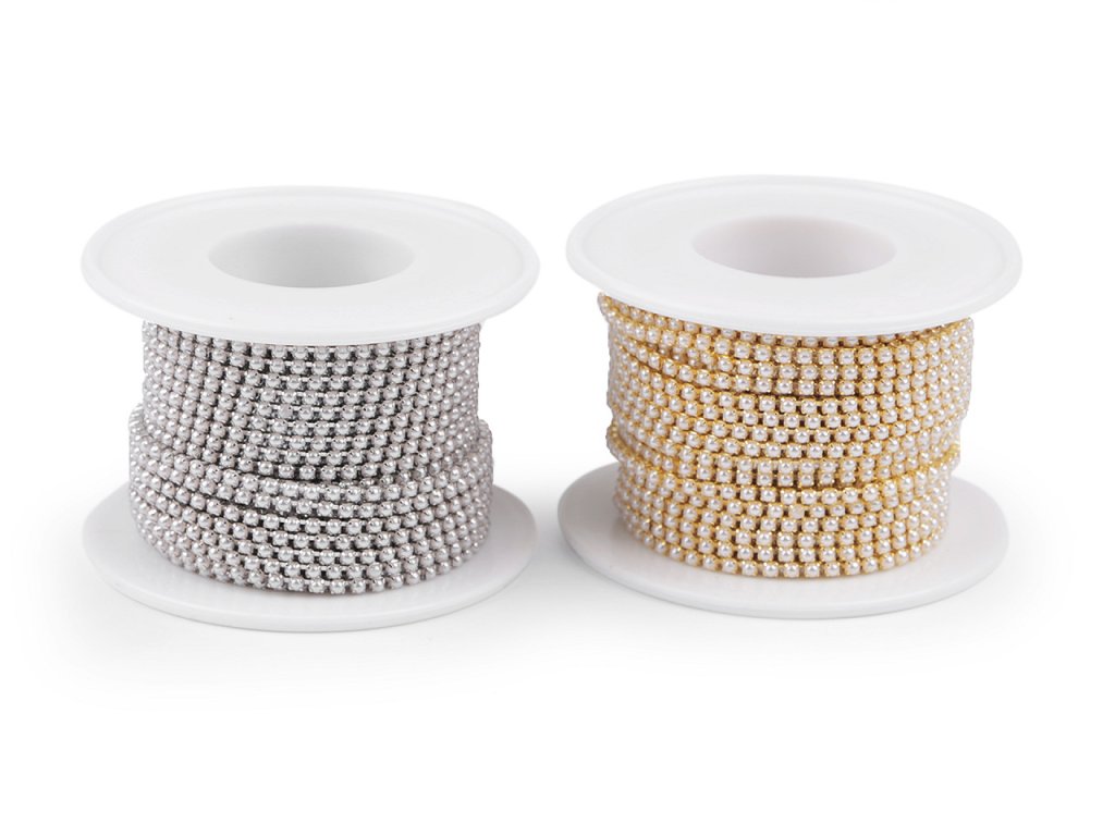 Luxusní bižuterní řetízková borta je ozdobená drobnými perlovými korálky, které jsou vsazené do kovových lůžek.