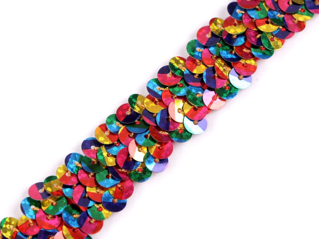 Elastický flitrový prýmek je velice efektní. Usnadní vám práci s jednotlivým našíváním flitrů. Flitry jsou připevněné na tenké pruženky cik - cak způsobem, působí bohatým dojmem. Po maximálním natažení pruženky se seřadí do dvou řad. Průměr flitrů je 6 mm.