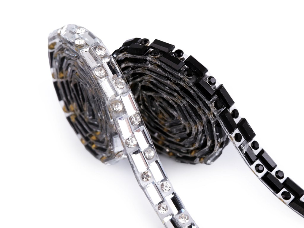 Nažehlovací prýmek s broušenými kamínky ušetří náročnou práci se zdobením oděvů. Díky skleněným broušeným kamínkům se oslnivě třpytí. Jeho základem je lepící vrstva, která po nažehlení na oděv pevně drží. Prýmek můžete nastříhat dle potřeby.