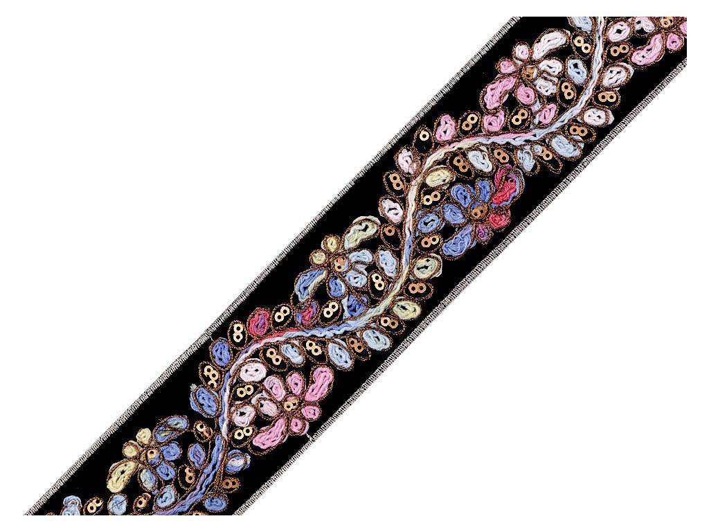 Vyšívaný prýmek s ornamenty. Jemně se třpytí díky všitému lurexovému vláknu a drobným flitrům. Prýmek můžete použít k ozdobení kabátů, svetrů, sak, šatů, sukní, kostýmů nebo bytového textilu. Podklad prýmku je z pevné imitace sametu.