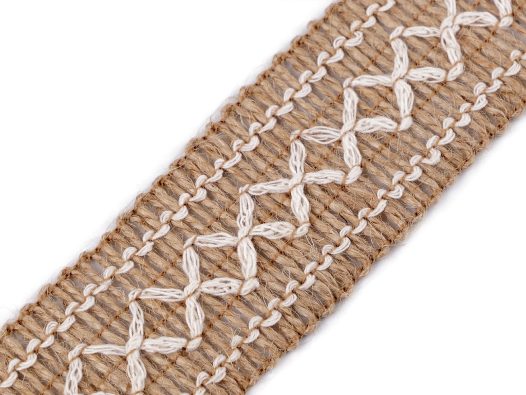 Jutový prýmek je jednostranný, ozdobený vzorem z bavlněných šňůrek. Vynikne v kombinaci s přírodními materiály. Můžete ho našít na prostírání, ubrusy, běhouny na stůl, klobouky nebo i tašky. Hodí se i k aranžování svateb v přírodním stylu, k jarním a velikonočním aranžmá. Využijí ho i čalouníci na ozdobení křesel, pohovek apod.