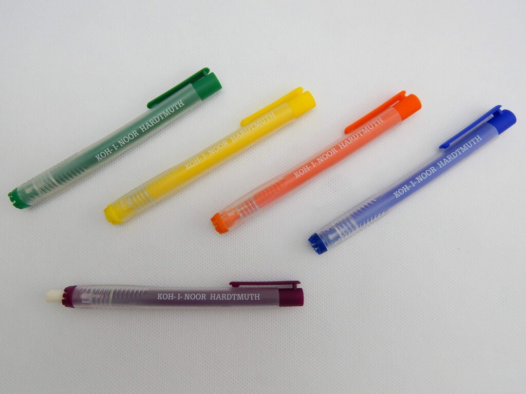Termoplastická výsuvná pryž je vhodná ke stírání grafitových čar určená pro školní i kancelářské potřeby. Délka 125 mm, průměr cca 12 mm. Pryž je v bílé barvě zasunutá v plastovém držáku s výsuvným mechanismem. Vnější část je v bílé transparentní barvě. Vnitřní část je v barvě žluté, modré, červené, oranžové, zelené a fialové. 12 ks pryží v držáku je vloženo do papírové krabičky.