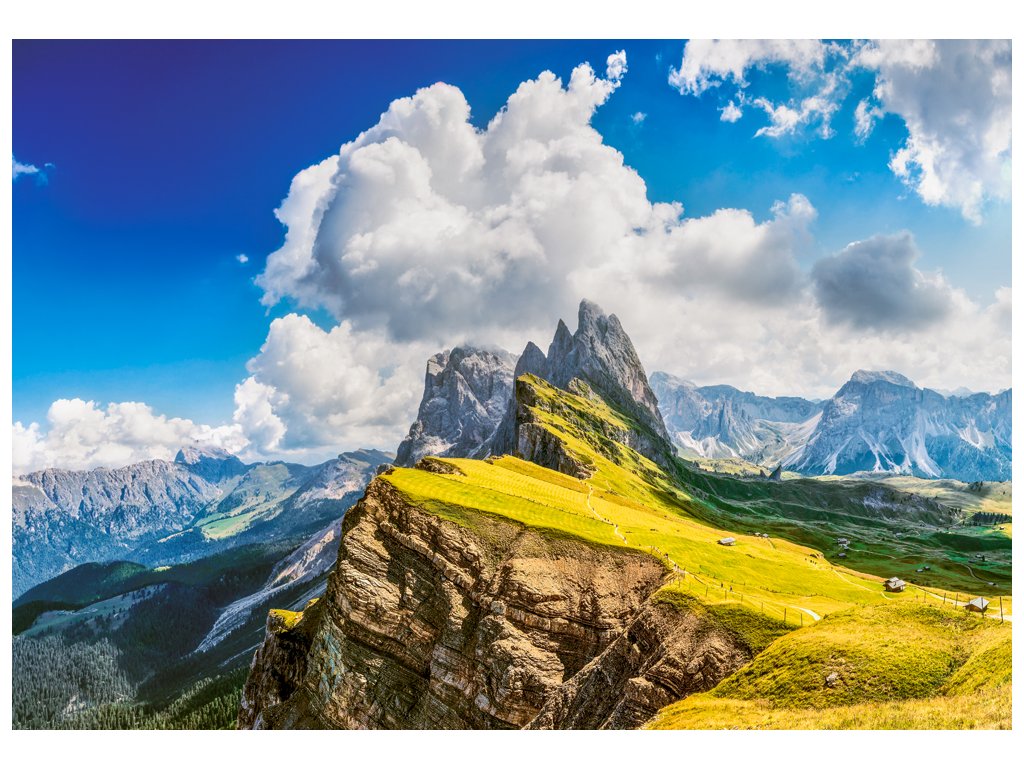 - Nádherná krajina: Detailní obrázek zachycuje majestátní Dolomity v celé jejich kráse, včetně zasněžených vrcholků, zelených luk a křišťálově čistých jezer.