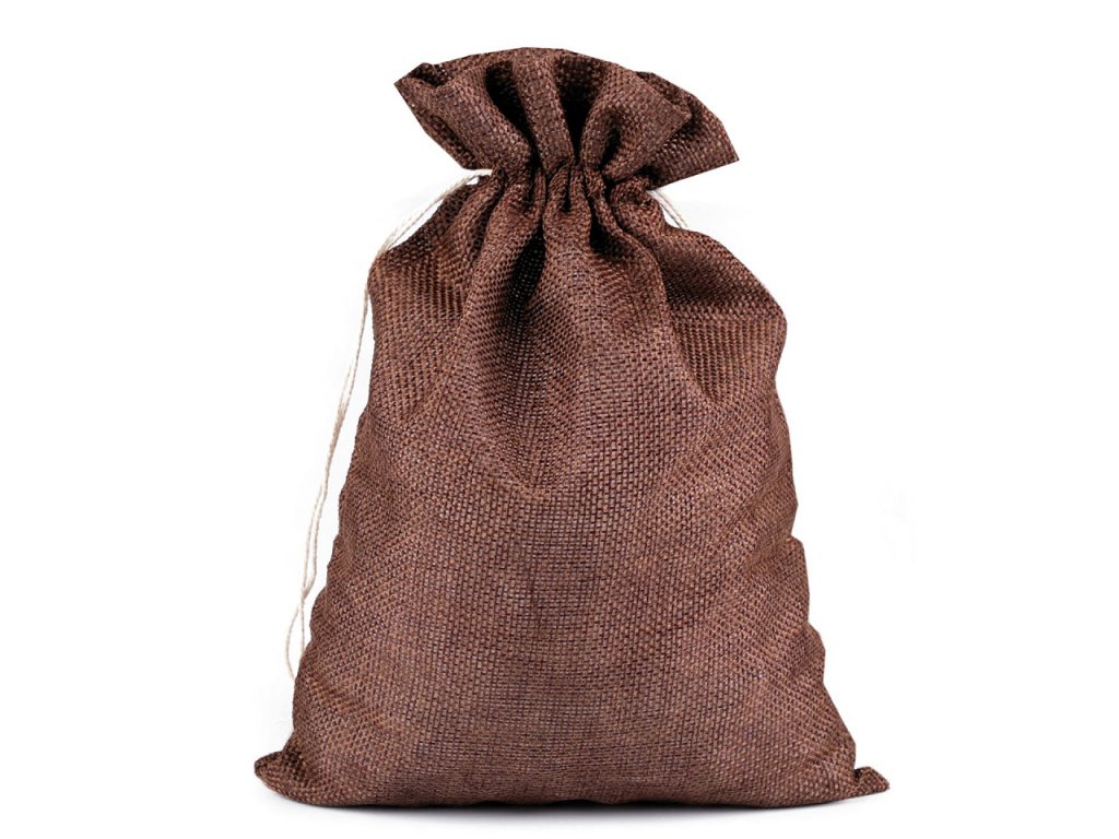 Pytlík se jednoduše stahuje pomocí šňůrky. Využijete ho na zabalení dárků nebo třeba jako vánoční dekoraci. Materiál pytlíku připomíná jutu.