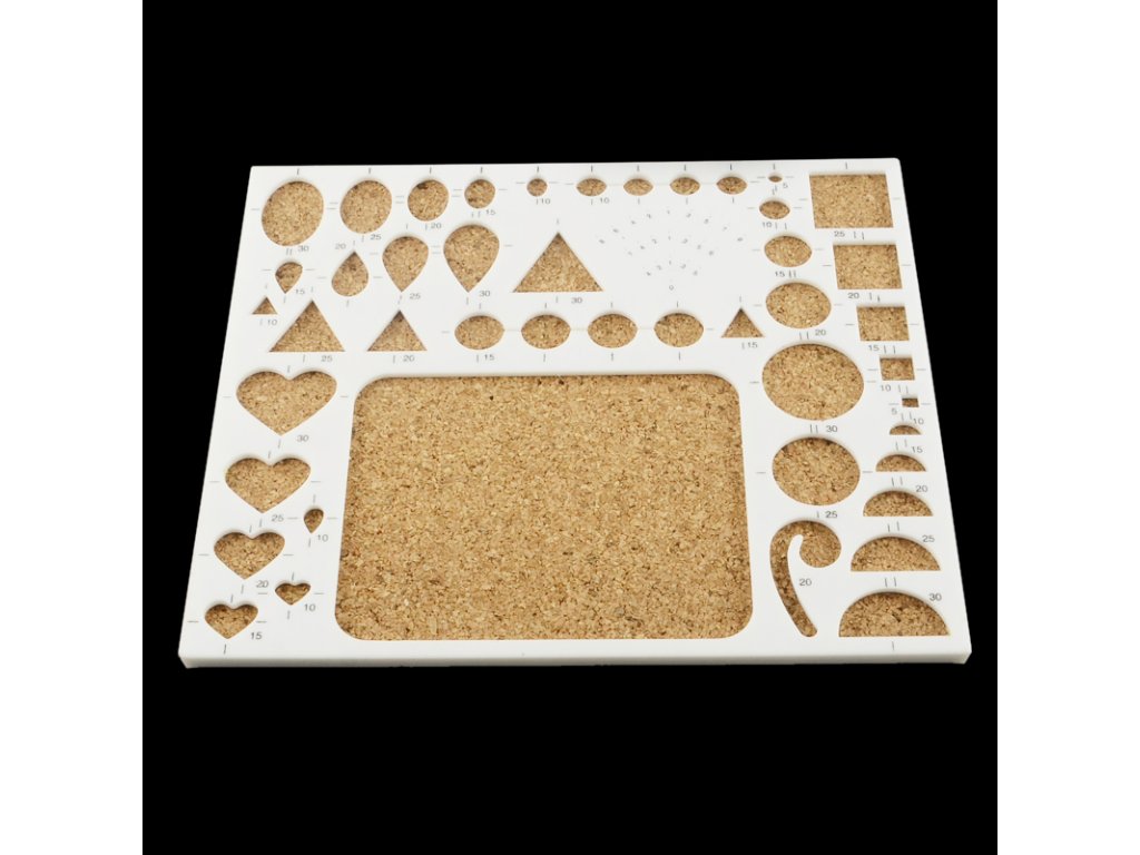 Šablona je z tvrdého plastu, s různými otvory. Kolečka, srdce, trojúhelníky, kapky, oválky, půloblouky, čtverce, atd. Je pevně podlepená korkovou podložkou, která se dá na techniku špendlíkování využít i z druhé strany. Můžete vytvořit pomocí špendlíků různě tvarované lístky.