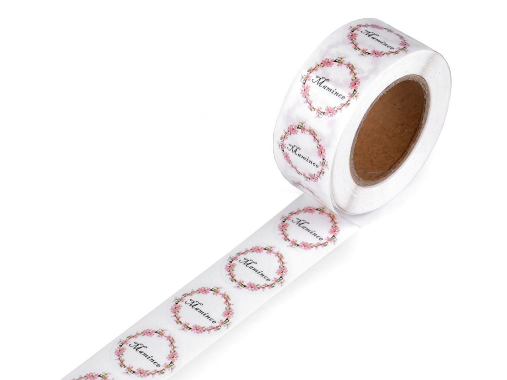Průhledné kulaté samolepky zdobí nápis "Mamince" umístěný v květinovém kroužku. Využijete je na zdobení dárků, přáníček, deníků, foto rámečků, alb, pozvánek, krabiček apod.