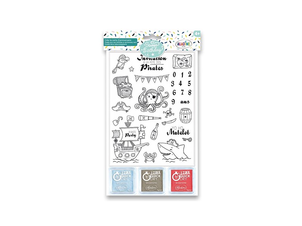 Kreativní razítka Aladine Stampo Birthday pro děti na blistru. Ideální na výrobu narozeninových pozvánek, narozeninovou výzdobu, na výtvarnou dílnu i hry na oslavě. Razítka mají široké využití v procvičování počítání, vybarvování, vystřihování. Sada Piráti obsahuje 30 nápaditých razítek.