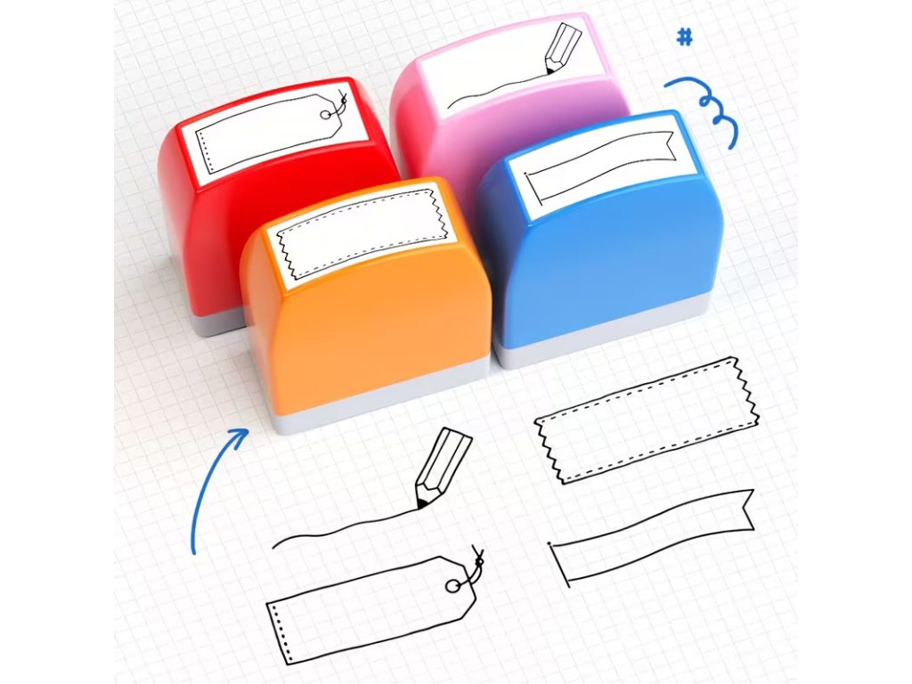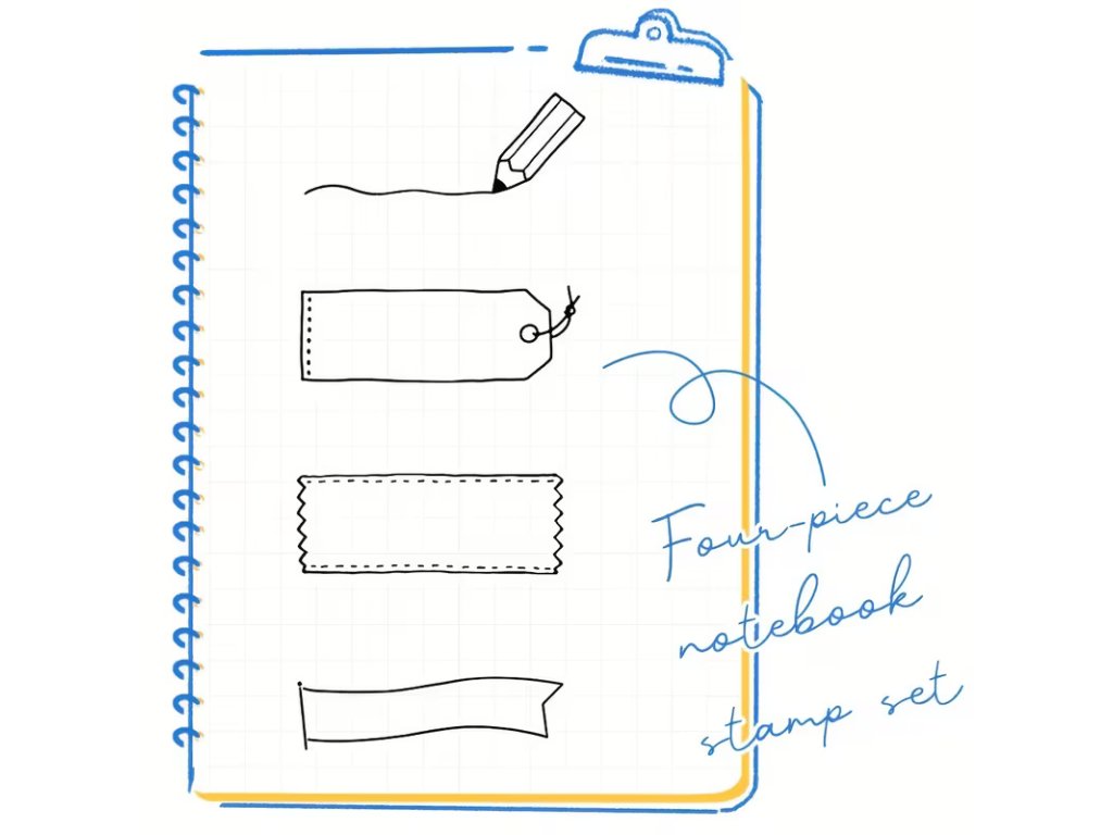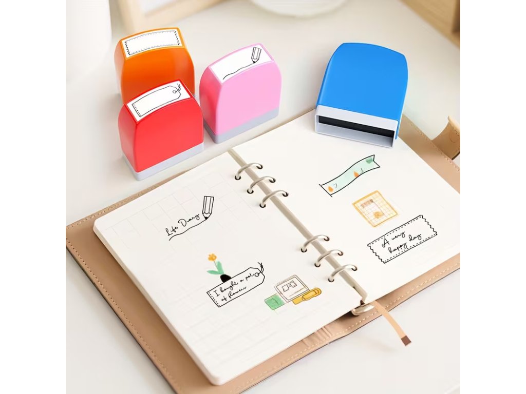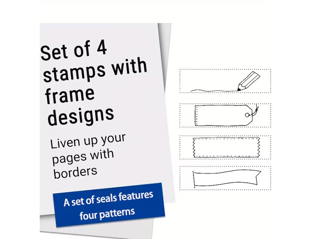 Tato kreativní sada obsahuje čtyři razítka s motivy ozdobných štítků, bannerů a vodicích linek, která dodají vašim zápiskům řád a styl. Razítka jsou již z výroby naplněna inkoustem, takže nevyžadují žádnou další podušku – stačí je jen přiložit a hned razítkovat.