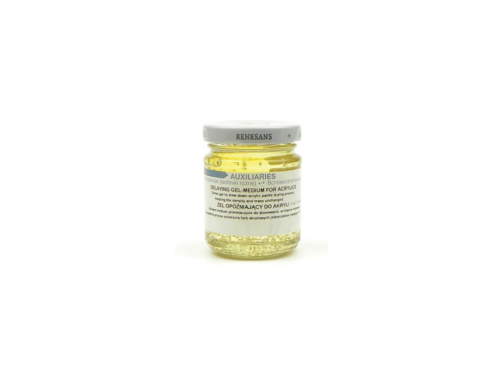 Zpomalovací gel pro akrylové barvy od značky Renesans v balení 110 ml. Gel smíchejte v malém měřítku s barvou a promíchejte, odstín ani hustota barvy se tím nezmění. Gel prodlouží dobu schnutí akrylových barev až na několikanásobně delší dobu, vhodné na zanechání možnosti pro dodatečné úpravy v malbě či na velké formáty.
