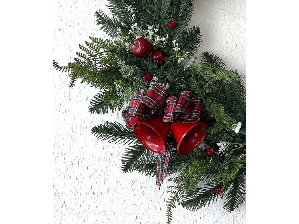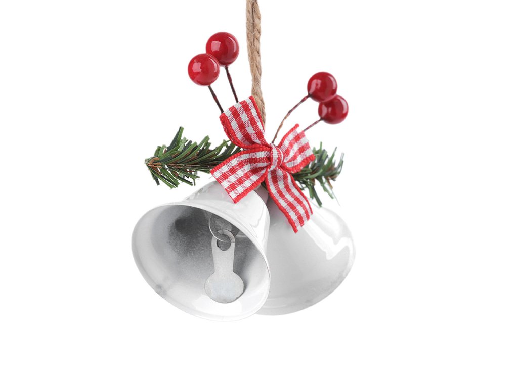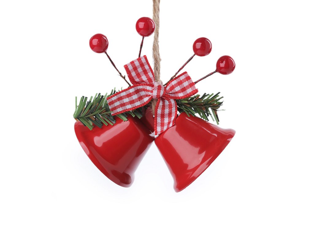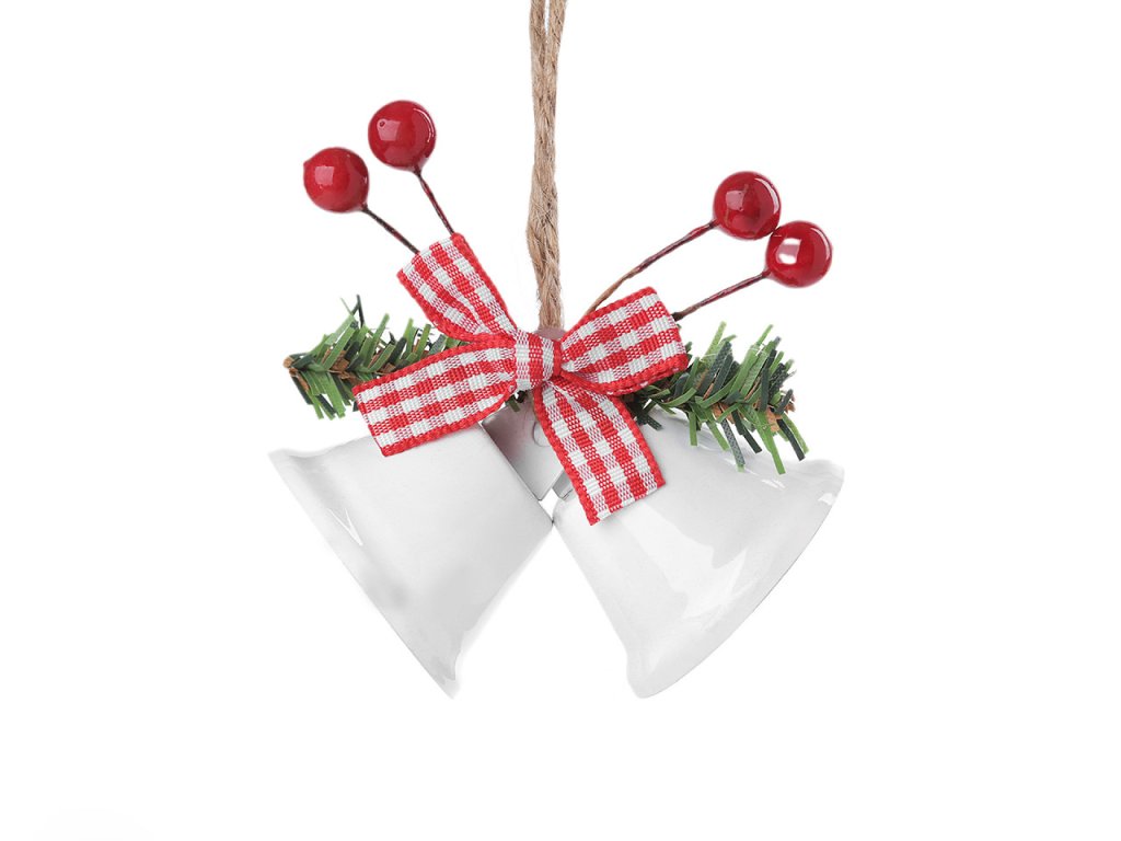 Kovové zvonečky využijete jako vánoční závěsnou dekoraci. Nahoře jsou ozdobené větvičkou, mašličkou a bobulemi. Mají poutko k zavěšení, můžete je pověsit na stromeček, větvičku ve váze nebo na dekorační girlandy a věnce.