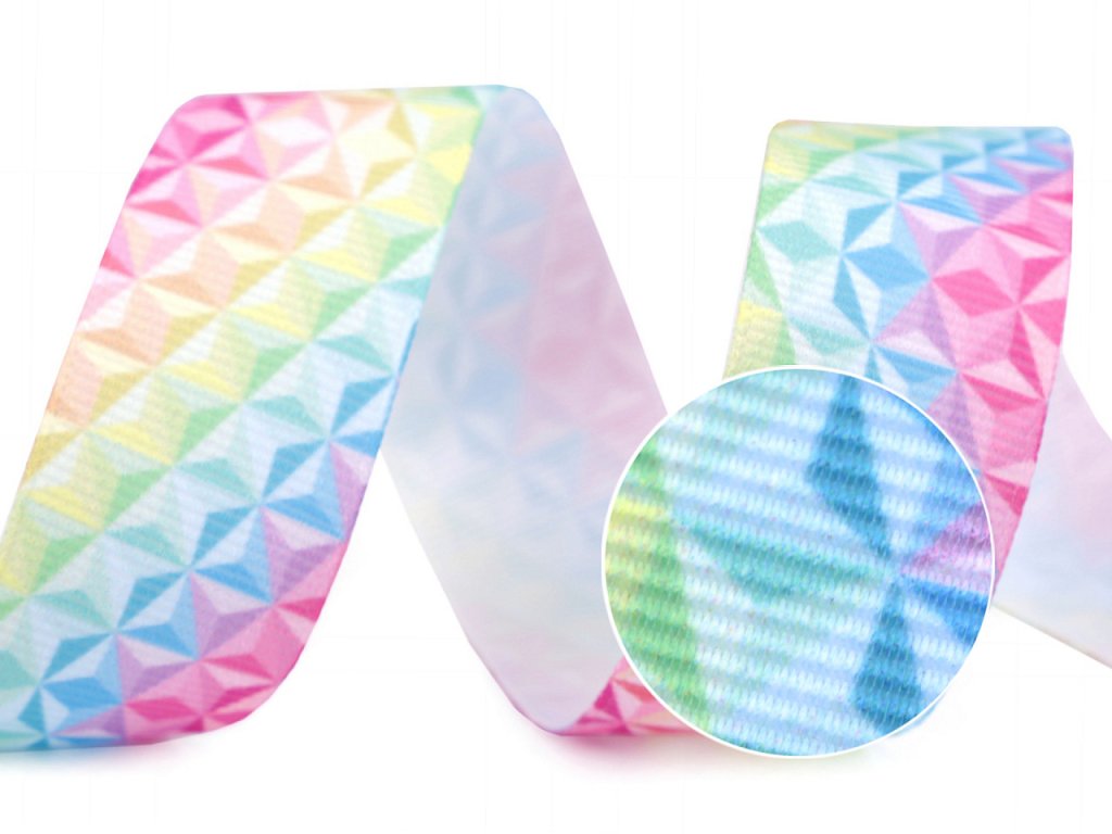 Rypsovou stuhu zdobí z jedné strany duhový geometrický vzor. Stuha s tímto propracovaným designovým motivem vynikne na kalhotách, kraťasech, sukních, mikinách i šatech. Využijete ji na výrobu klíčenek nebo zdobení tašek, polštářů apod. Je vhodná také k nalepení na přáníčka, alba, deníky apod. v technice scrapbooking.