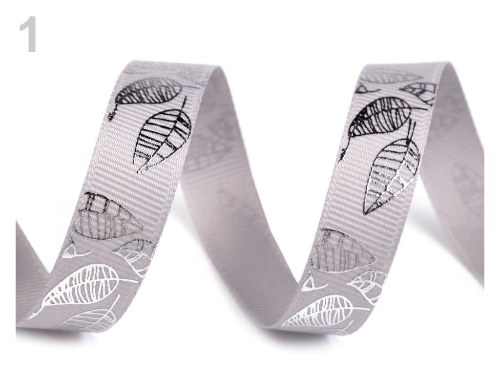 Rypsová stuha šíře 15 mm s listy - šedá/stříbrná (5m)