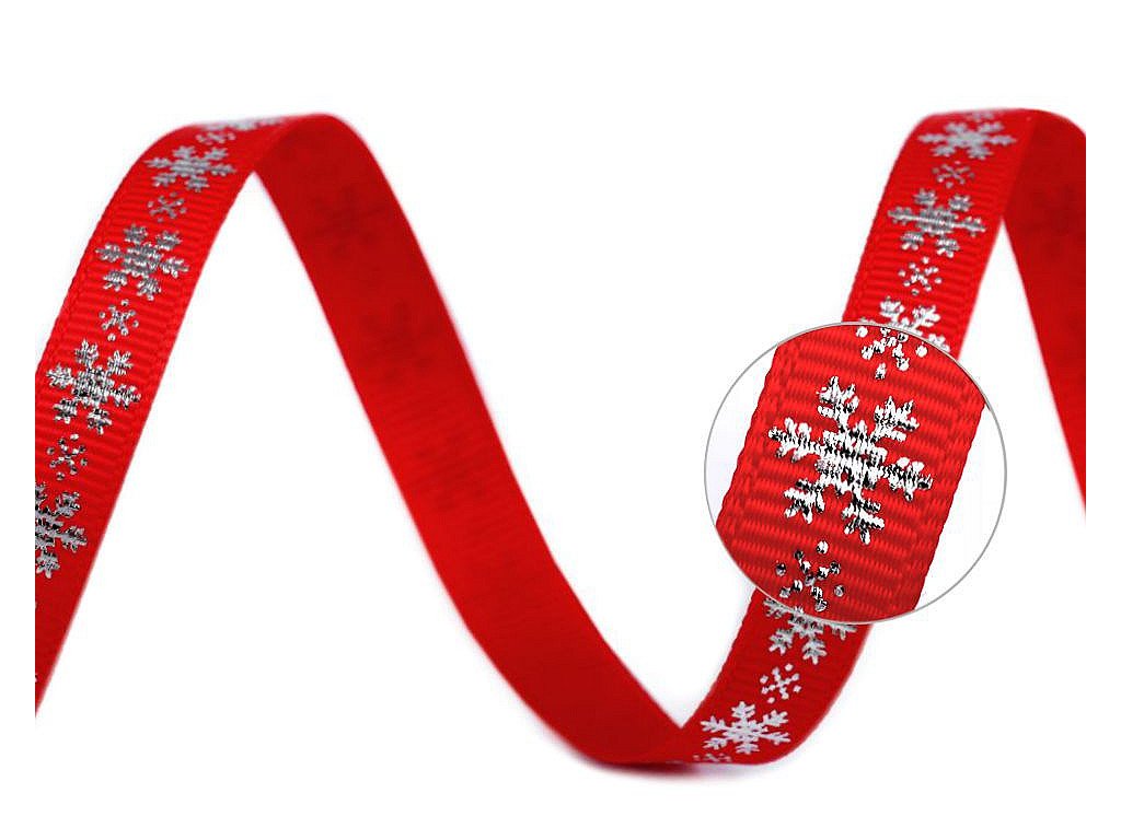 Dekorační rypsová stuha s potiskem vloček má na povrchu typické jemné žebrování. Potisk je jednostranný, metalický, připomíná lurex.