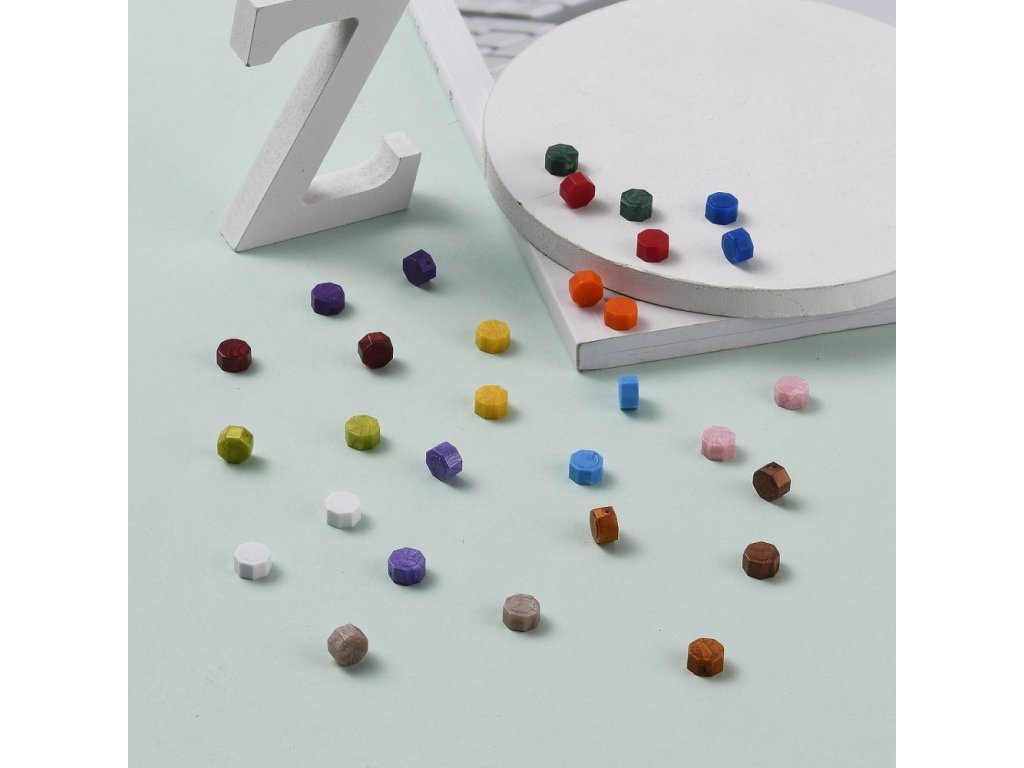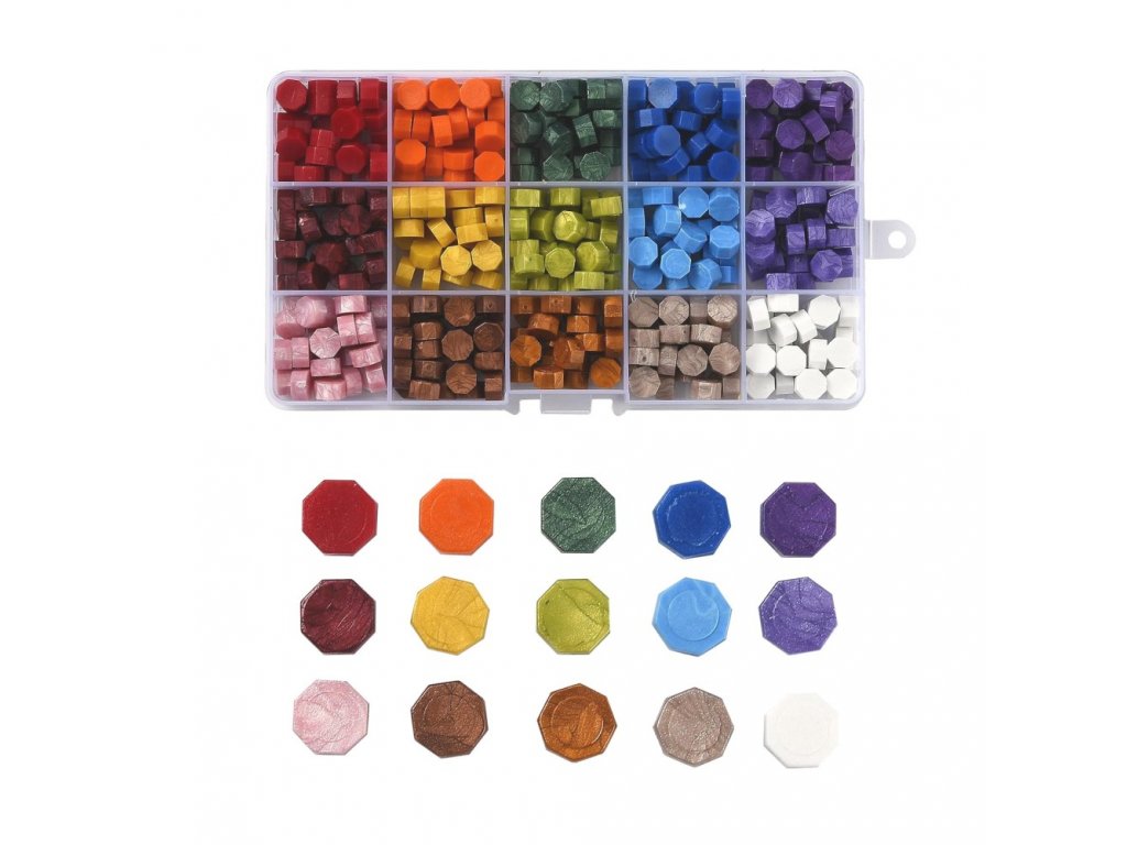 Sada barevného mixu pečetícího vosku ve formě granulek v praktické uzavíratelné krabičcce.