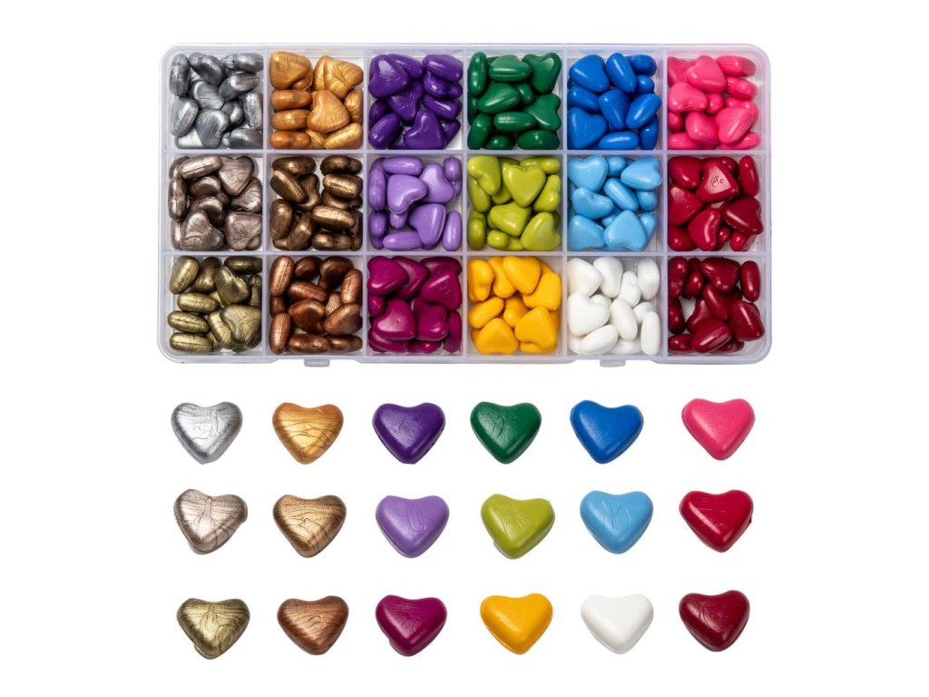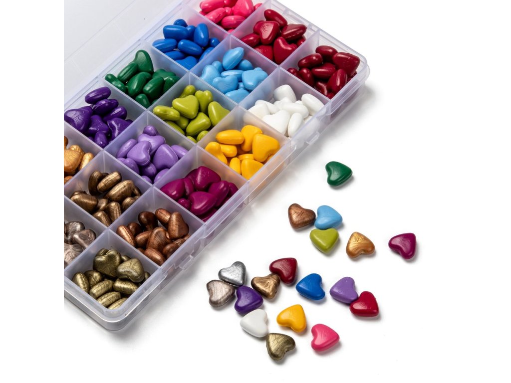 Sada barevného mixu pečetícího vosku ve tvaru srdíček v praktické uzavíratelné krabičce.