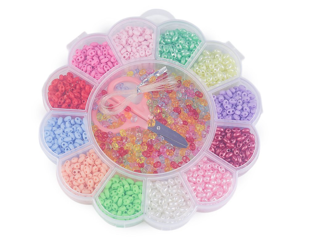 Sada dvoudírkových plastových korálků v průhledném boxu potěší malé i velké korálkářky. Praktický organizér ve tvaru květu nabízí širokou škálu barevných korálků, které jsou ideální pro vytváření originálních šperků, dekorací či módních doplňků. Box je navržen tak, aby jednotlivé barevné odstíny byly snadno dostupné a uspořádané. Design dvoudírkových korálků umožňuje vyrábět různé náramky, náhrdelníky a korálkové kytičky, které jsou velice oblíbené.