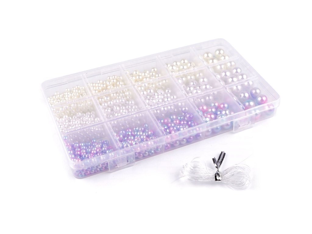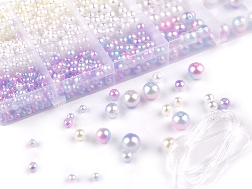 Plastový box obsahuje mix plastových perel a silikonovou pruženku na navlékání. Najdete v něm korálky bílé a perlové barvy, a s růžovo - modro - fialovým přechodem barev. V boxu je od každé barvy 5 různých velikostí.