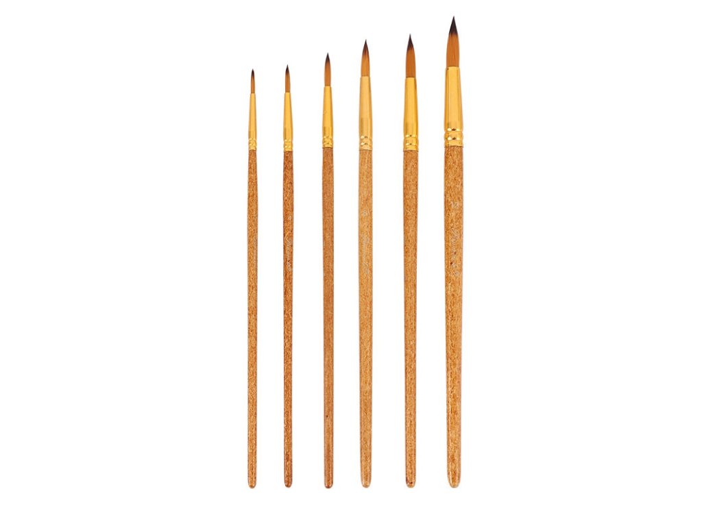 Sada 6 štětců na malování s nylonovými vlákny a dřevěnými rukojeťmi, ideální pro profesionální umělce i začátečníky. Štětce jsou vhodné pro akvarelovou malbu a další techniky. Díky kulatým a špičatým tvarům umožňuje sada všestranné využití – od detailní práce po hladký nános barvy na větší plochy.