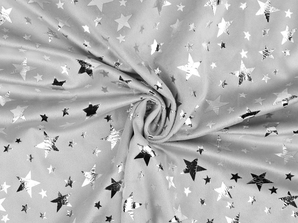 Samet s metalickým potiskem hvězd je příjemný, měkký, hladký na dotek a je mírně elastický, pruží po šíři. Využijete ho na výrobu teplákových souprav, bund, vest, mikin apod. Je vhodný i na šití bytového textilu. Bude se vyjímat na andělských kostýmech.