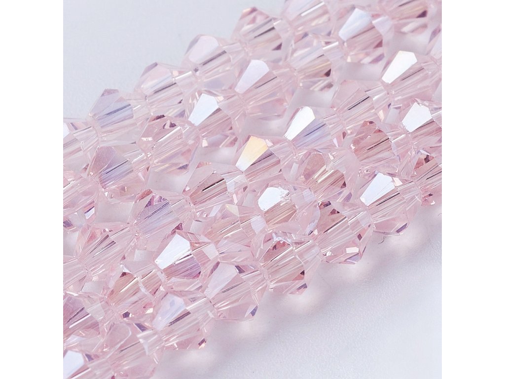 Sada transparentních skleněných korálků ve tvaru bicone je ideální pro vaše tvoření – například výrobu šperků, dekorací nebo dalších ručních prací. Korálky mají lesklý broušený povrch s efektem AB, díky čemuž krásně odrážejí světlo a dodávají výrobkům eleganci a jemný lesk.