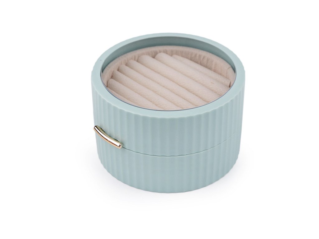 Malá kulatá šperkovnice s průhledným víčkem je velice atraktivní. Vaše prsteny či náušnice uvidíte na první pohled. Po odklopení víčka se pod přihrádkami na prsteny nachází další prostor, kam si můžete uložit řetízky, náramky apod. Využijete i kapsičku a nad ní 4 háčky. Zavírá se na magnetické zapínání.