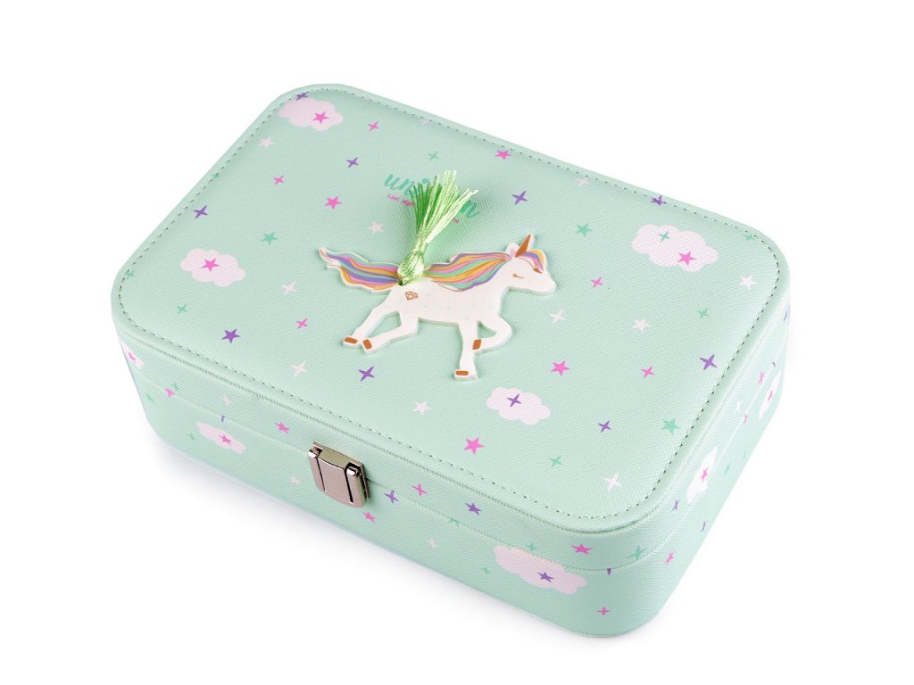 Šperkovnice s motivem jednorožce se střapečkem má velice kvalitní a precizní provedení. Ochrání vaše šperky před nepříznivými vlivy okolí, jako je světlo nebo vlhkost. Součástí šperkovnice je kovové zapínání. Uvnitř je 5 přihrádek, polštářek na brože, hodinky či náramky, oddíl na prsteny, kapsa a zrcátko.