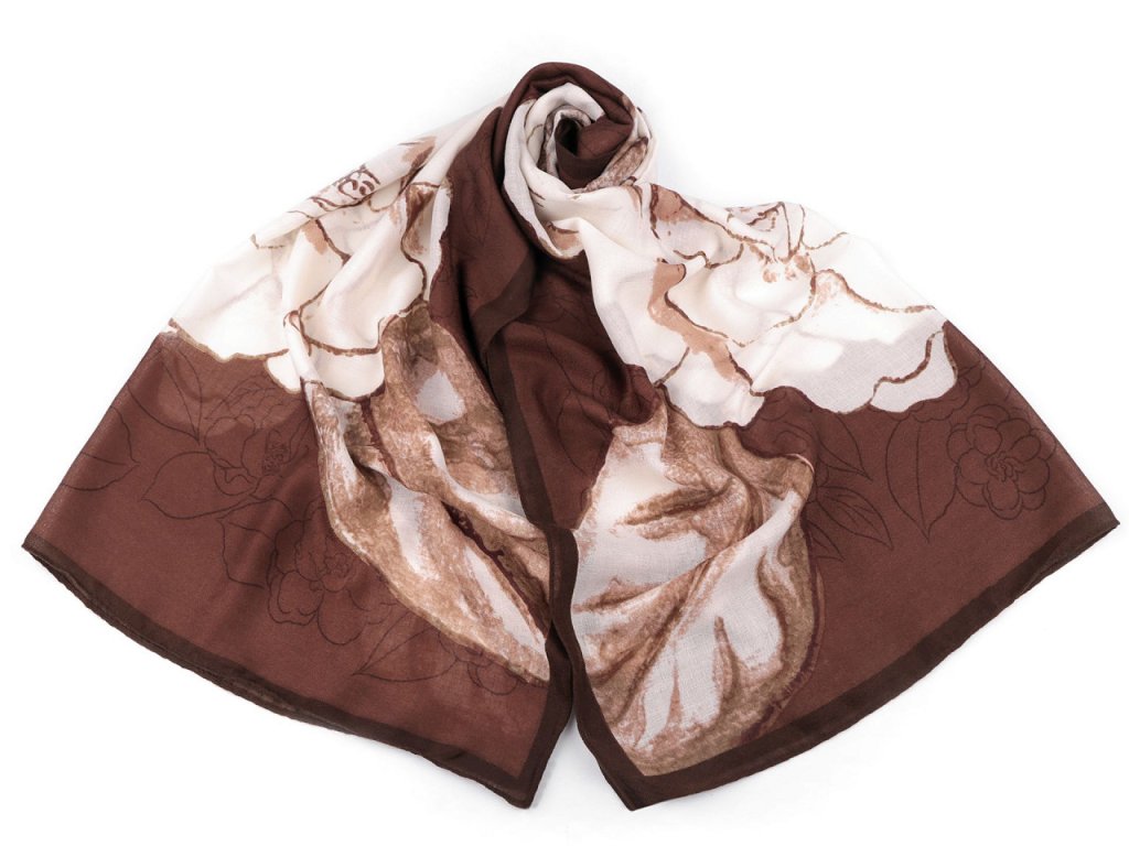 Velkou šálu s motivem velkých květů si můžete vzít do společnosti i na všední nošení ke kabátu, saku, halence, svetříku, šatům apod. Je měkká, příjemná na dotek, hezky splývá.