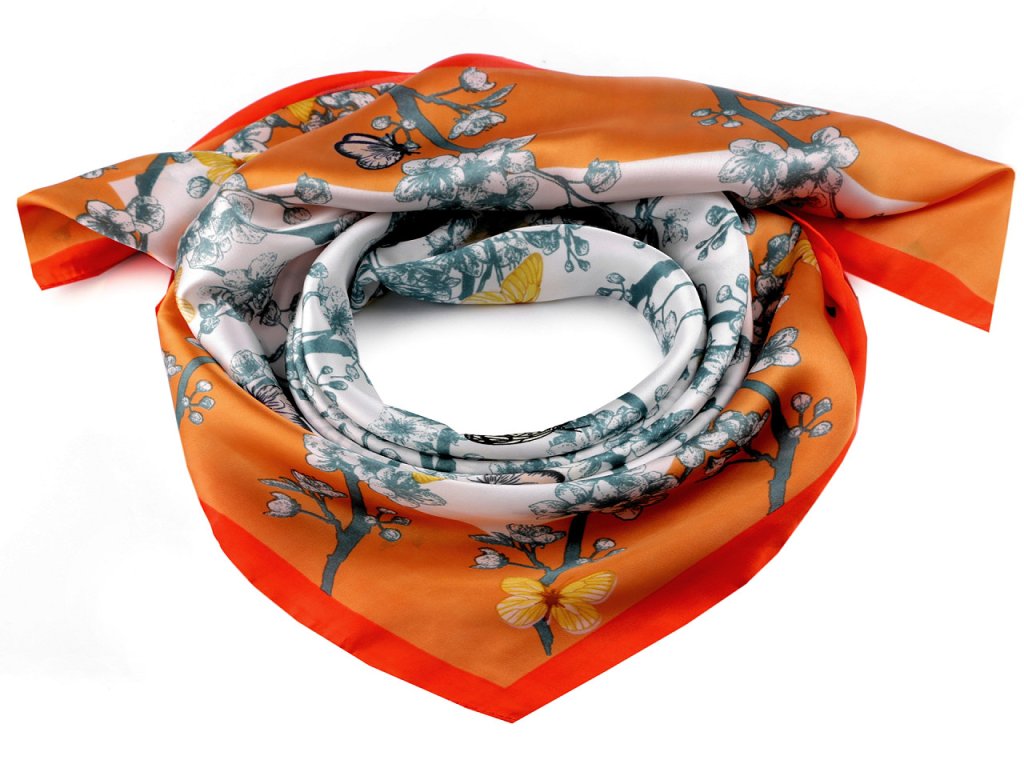 Saténový šátek s potiskem motýlů je elegantním módním doplňkem, kterým oživíte jednobarevné sáčko, halenku, šaty i tričko. Příjemný materiál s jemným leskem vás bude hýčkat. Šátek je oboustranný, čtvercový tvar můžete variabilně upravit kolem krku.