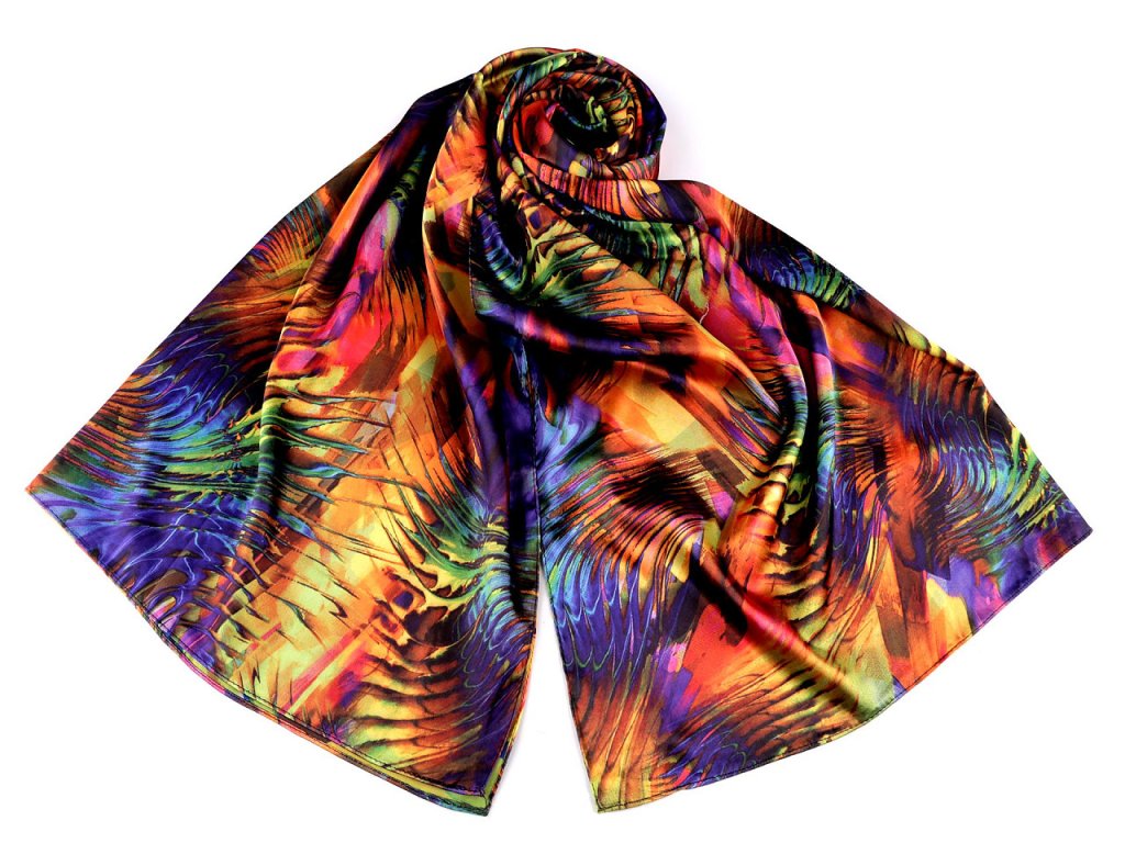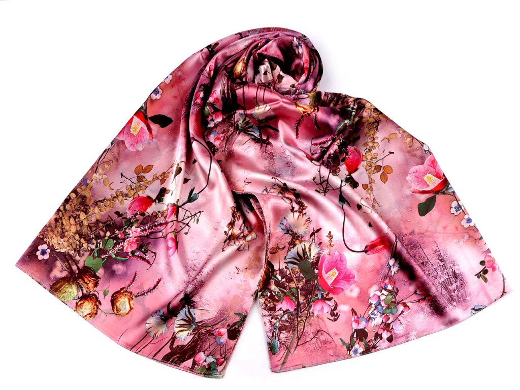 Luxusní saténová šála je zcela unikátní, protože má na přední i zadní straně úplně odlišný vzor. Na jedné straně jsou například květy růží a na zadní mohou být listy v podzimní barvách. Mimoto je lehounká a měkká, na dotek připomíná hedvábí. Využijete ji do společnosti i na všední nošení ke kabátu, saku, halence, svetříku, šatům apod.
