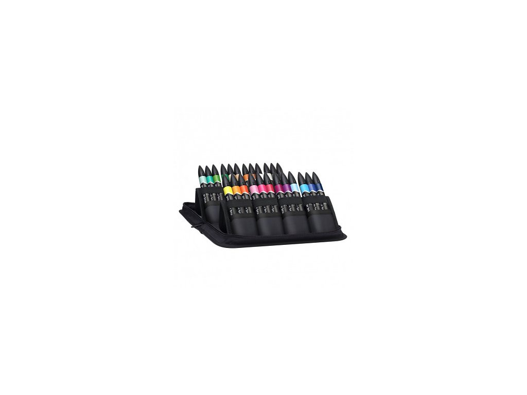 Sada 24 odstínů. Textilní penál se zipem a úložným prostorem, který nabízí několik možností rozložení.