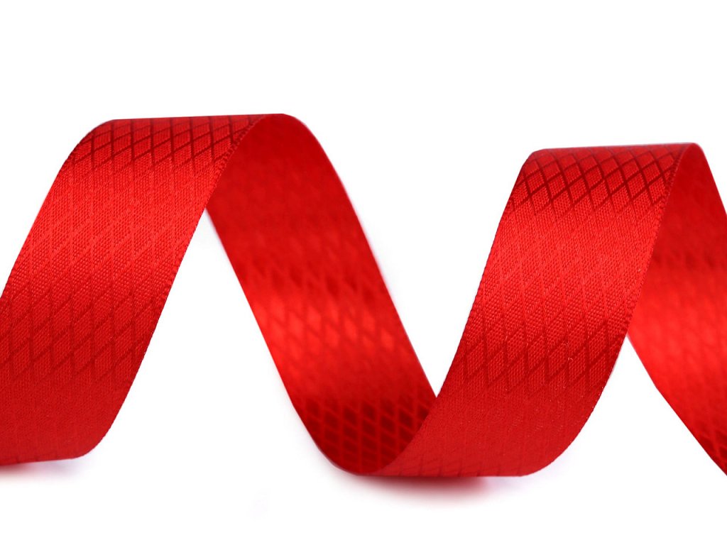 Atlasová stuha s jemným dekorem kosočtverců je pevná, velice kvalitní. Je oboustranná, ale zadní strana je lesklejší.