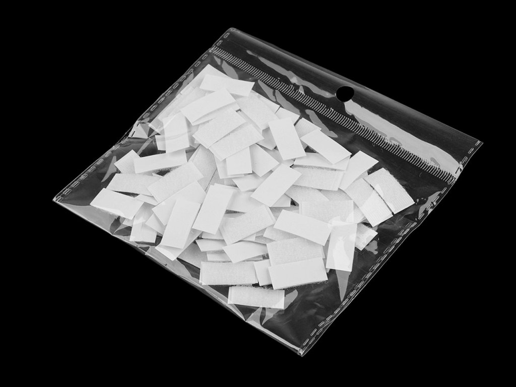 Suchý zip ve tvaru malých obdélníků je samolepicí. S jeho pomocí můžete připevnit nápisy, obrázky, zalepit plastové obálky, krabičky apod. Využijete ho i k výrobě quiet booku pro děti.