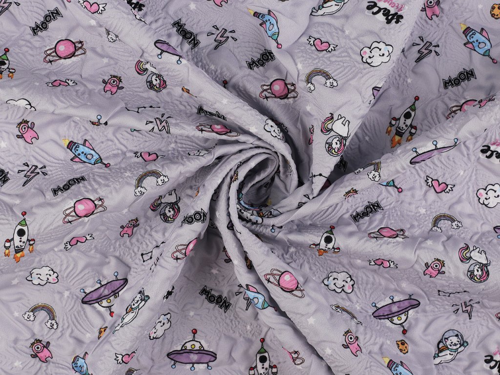 Šusťákovina je zpevněná tenkou podšívkou na rubové straně. Má mačkaný vzhled s drobným potiskem vesmíru. Není voděodolná.