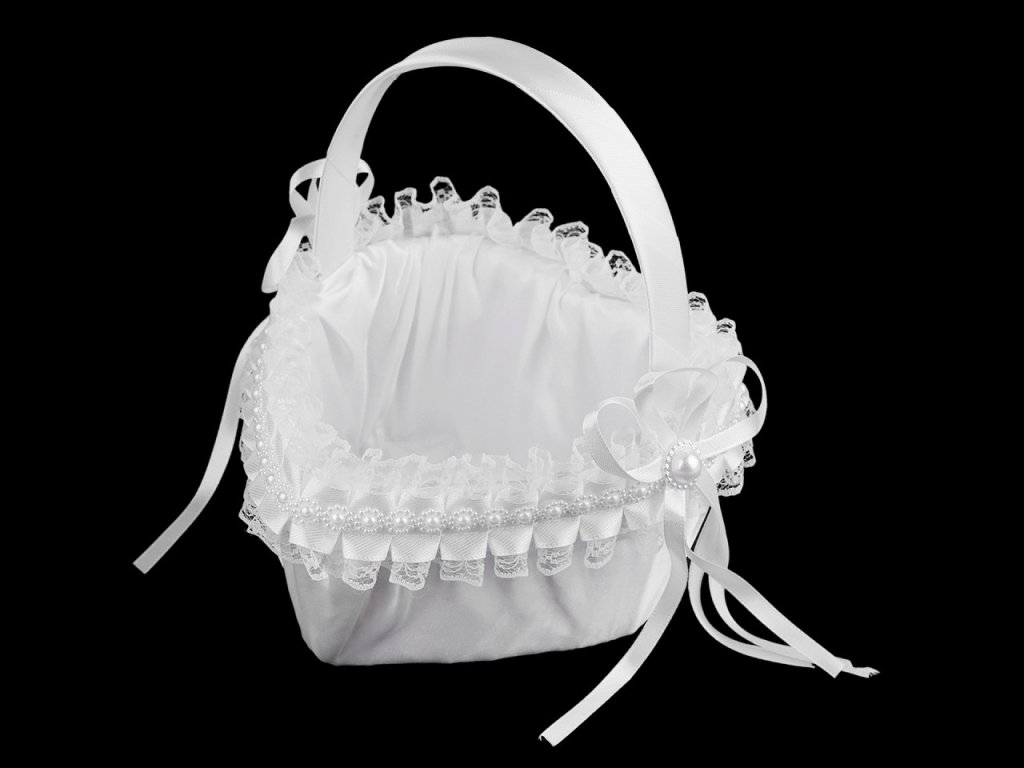 Saténový košíček je skvělým svatebním doplňkem pro všechny družičky. Má tvar srdce. Uvnitř košíčku se budou vyjímat plátky růží nebo květinová aranžmá. Košíček je vyrobený z pevnějšího plastu. Zdobí ho mašle ze stuh, perlová aplikace a krajka.