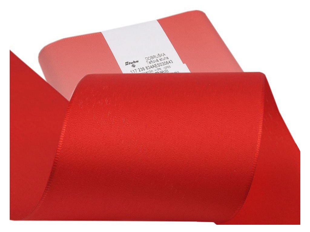 Podniková norma fa Stuha povoluje na 10-ti metrových návinech dva odstřihy, které jsou k sobě slepené, tolerance u 10-ti m návinů je +/-10cm. Světlejší odstíny budou vždy širší, než tmavé odstíny a to z důvodu, že nelze z kapacitních a technologických důvodů barvit všechny barvy na jedné lince, proto se může šíře barevné stuhy srazit až o 5mm.Taftovou stuhu v šíři 108 mm můžeme použít na šerpy pro různé příležitosti např. maturitní plesy, na "stužkovou", a pod. [Dodáváme v návinu po 10 m.]