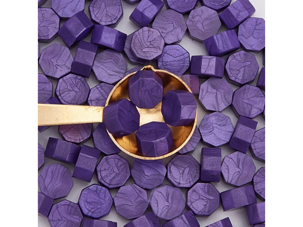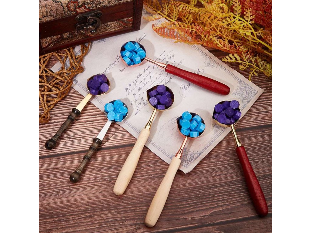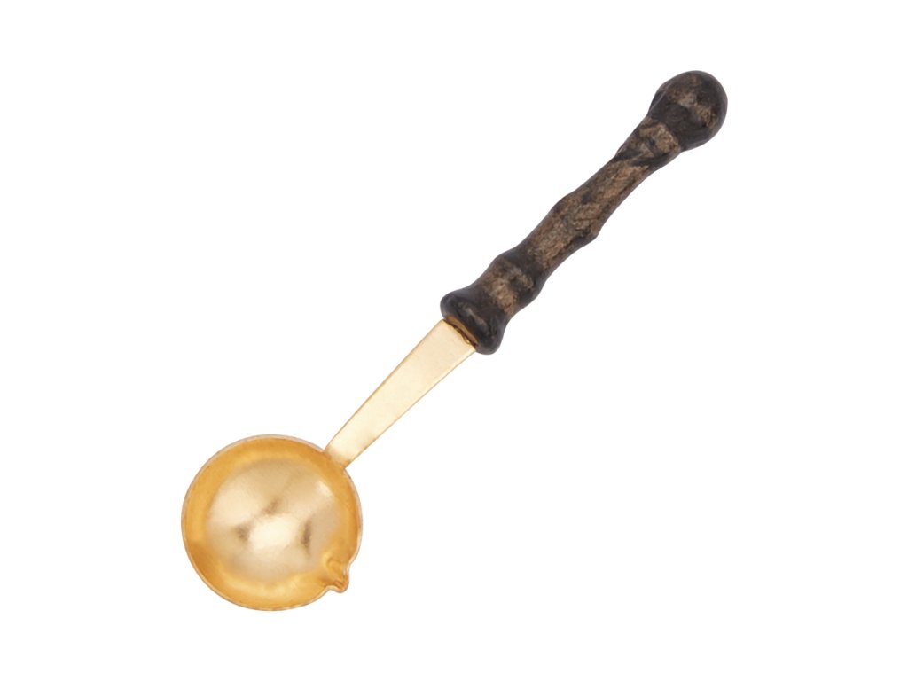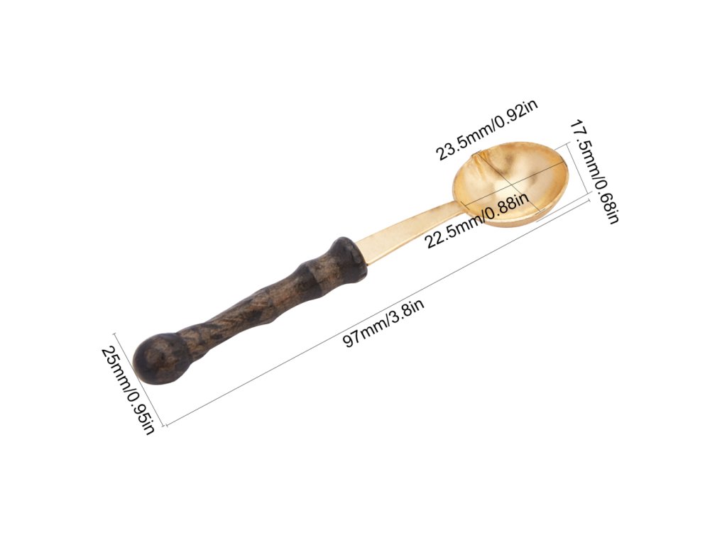 Kovová lžička pro tavení vosku nad svíčkou. Lžička má dřevěnou rukojeť.