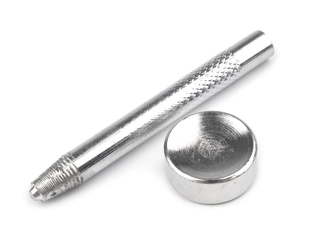 Kovový razič využijete k aplikaci [narážecích knoflíků.] K raziči patří kulatá kovadlinka (Ø22 mm), která je oboustranná. Na kovadlinku položíte knoflík s příslušnou doplňující částí, přiložíte razič a udeříte do něj kladivem.