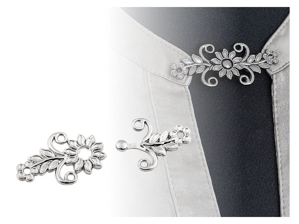 Ozdobné zapínání s květinovým motivem se skládá ze dvou protikusů, které do sebe skvěle zapadají. Využijete ho na svetříky, saka, kabelky, halenky či kabátky. [Zajímavé je jeho použití také ke zmenšování obvodu kalhot či sukní.]